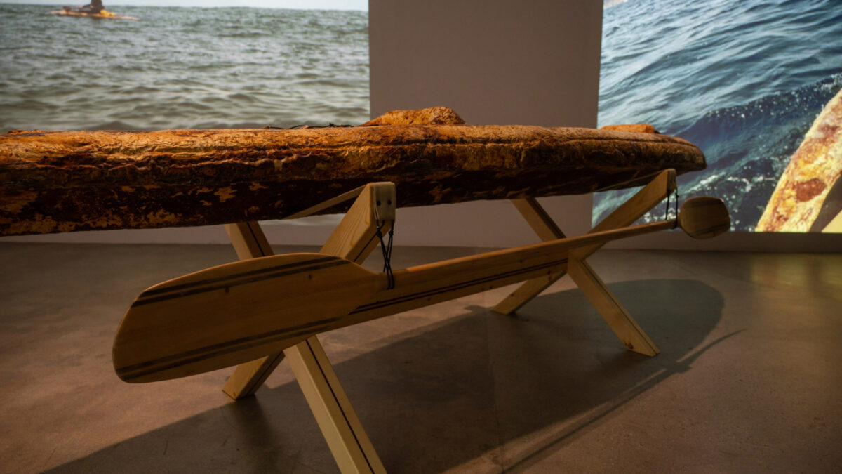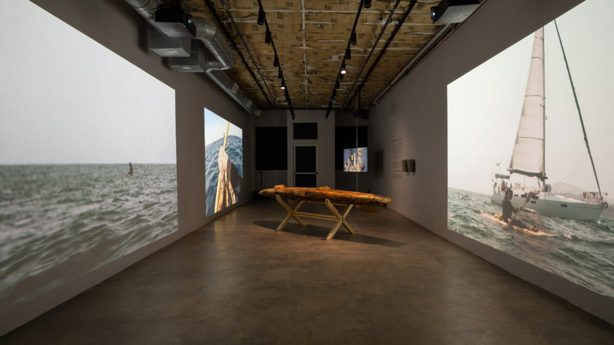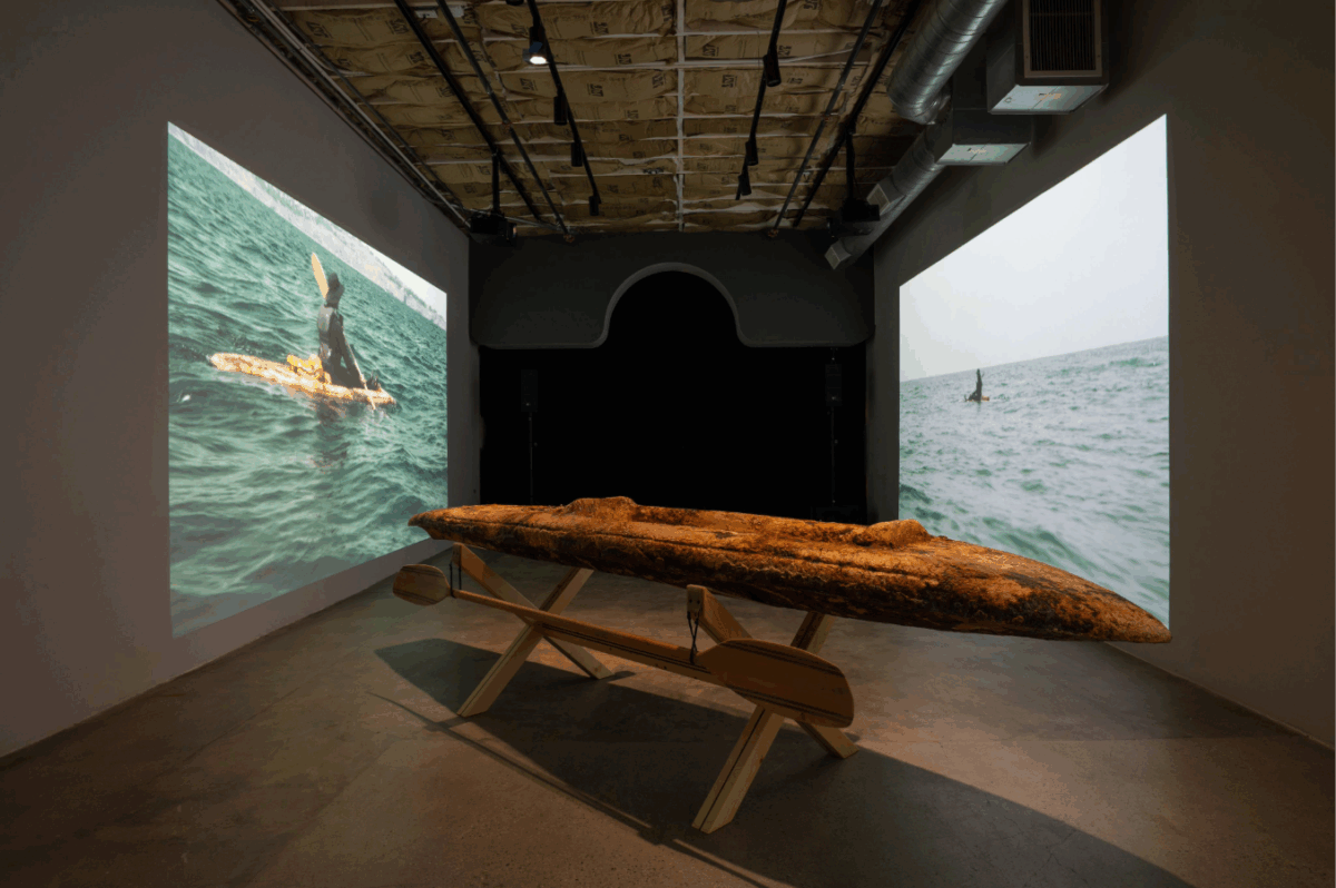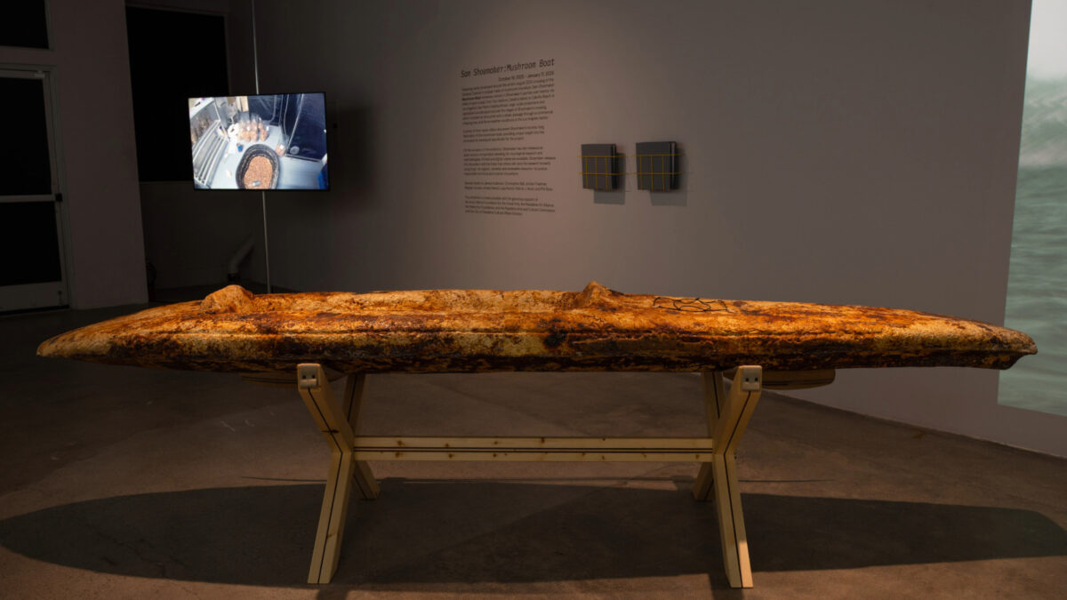 Alongside the mushroom boat itself, the exhibition features large-scale projections, time-lapse videos, and soundscapes that immerse visitors in Shoemaker’s journey over 26 miles of open ocean, where he passed through turbulent water, encountered wildlife, crossed a commercial shipping lane, and battled headwind.